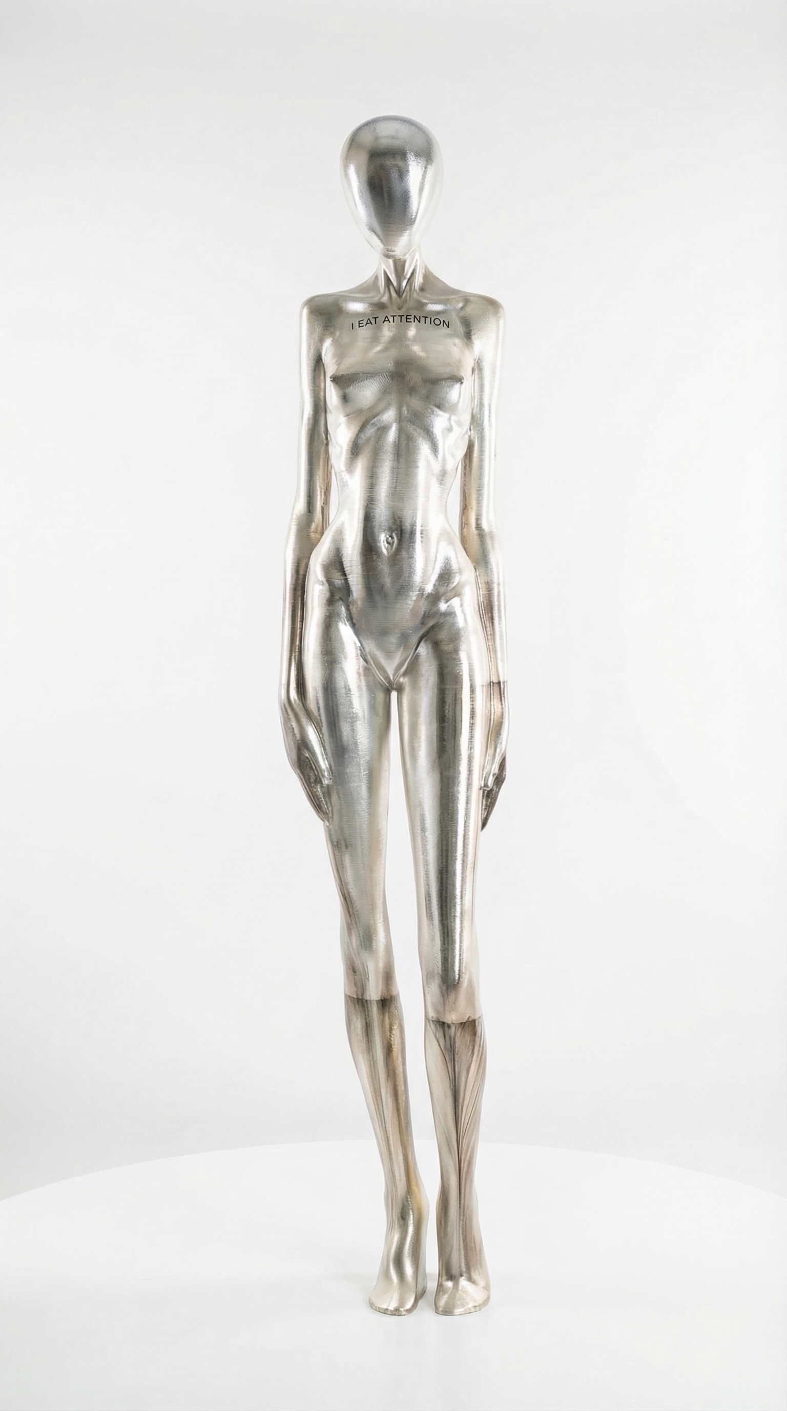 Inscribed like a confession—“I EAT ATTENTION”—the work reframes hunger as a social economy. The body is no longer fed by food, but by looking: by approval, by desire, by the silent measurement of worth. Chrome turns the sculpture into an arena of reflection, implicating the viewer in the cycle it critiques. You see yourself on the surface, and the question lands sharply: who is starving here—this figure, or the culture that taught it to crave validation more than sustenance?